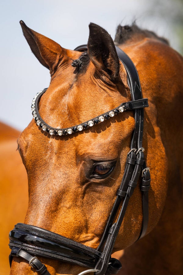 - Frontriem met prachtige zwart en zilveren kristallen. Het Hoofdstel wordt geleverd met extra losse strass-steentjes.