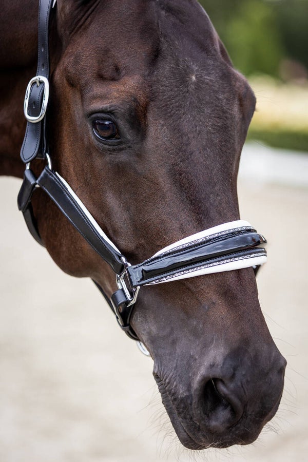 - Prachtige lakneusriem met een witte padding en een chique glitterrand.