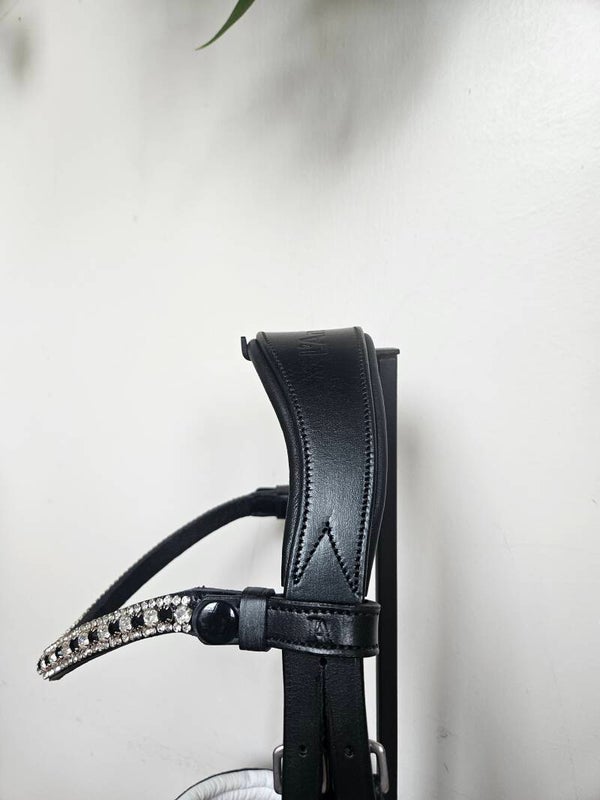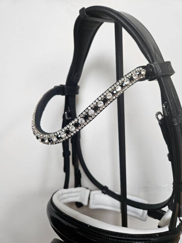 - Wit onderlegde lak neusriem, omringd met zwarte steentjes. Inclusief sperriem.
