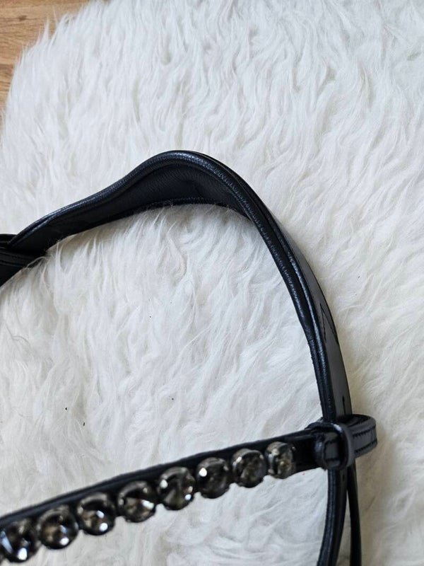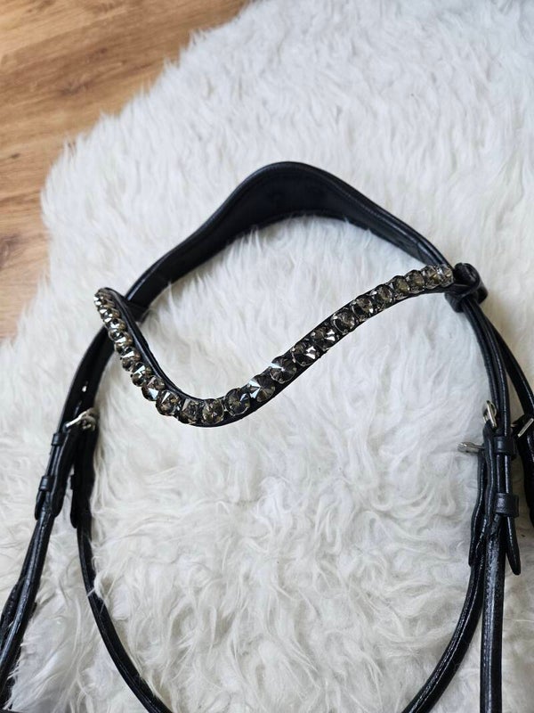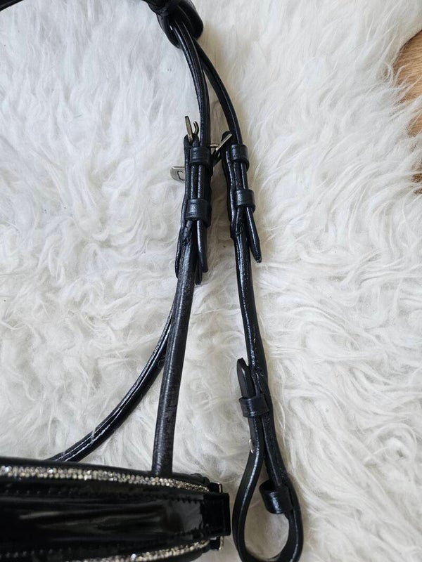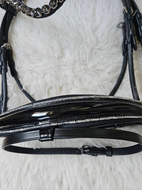 - Anatomische neusriem, Zwart onderlegd, inclusief sperriem. Het hoofdstel heeft een luxe lak laag, welke is omringd door zilveren glitter rand.